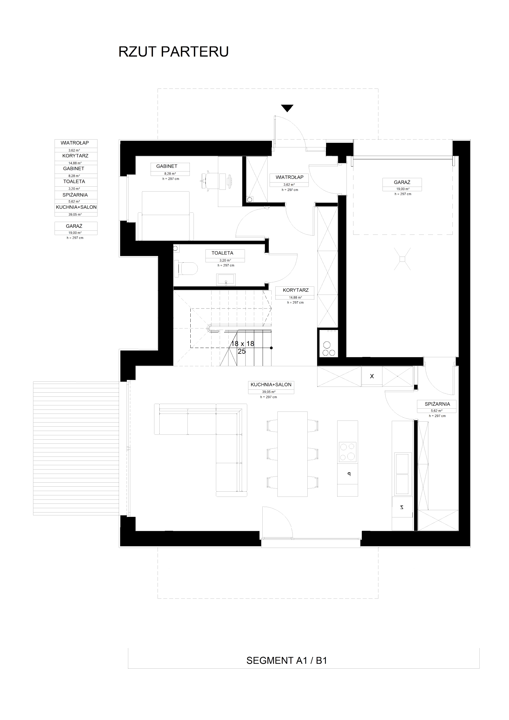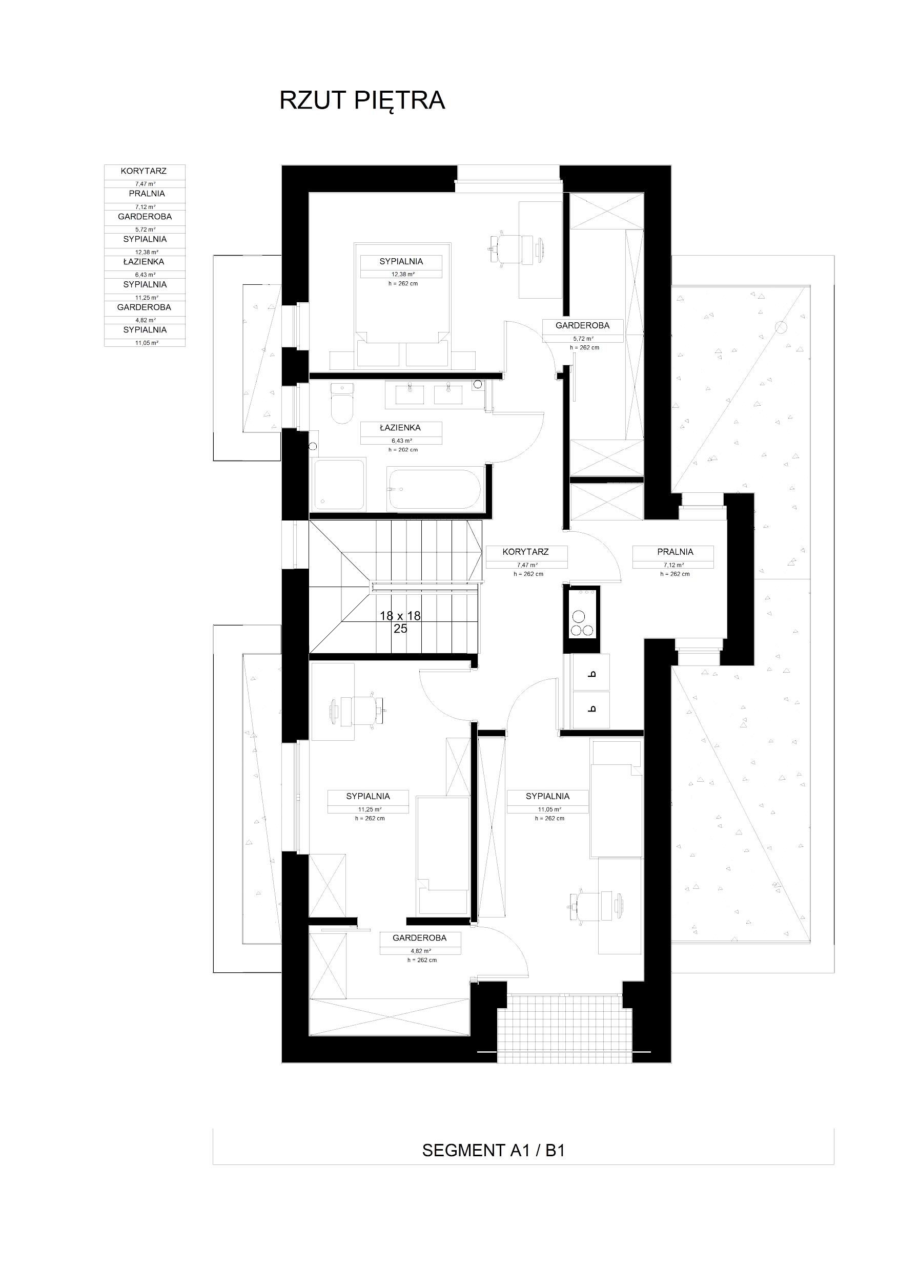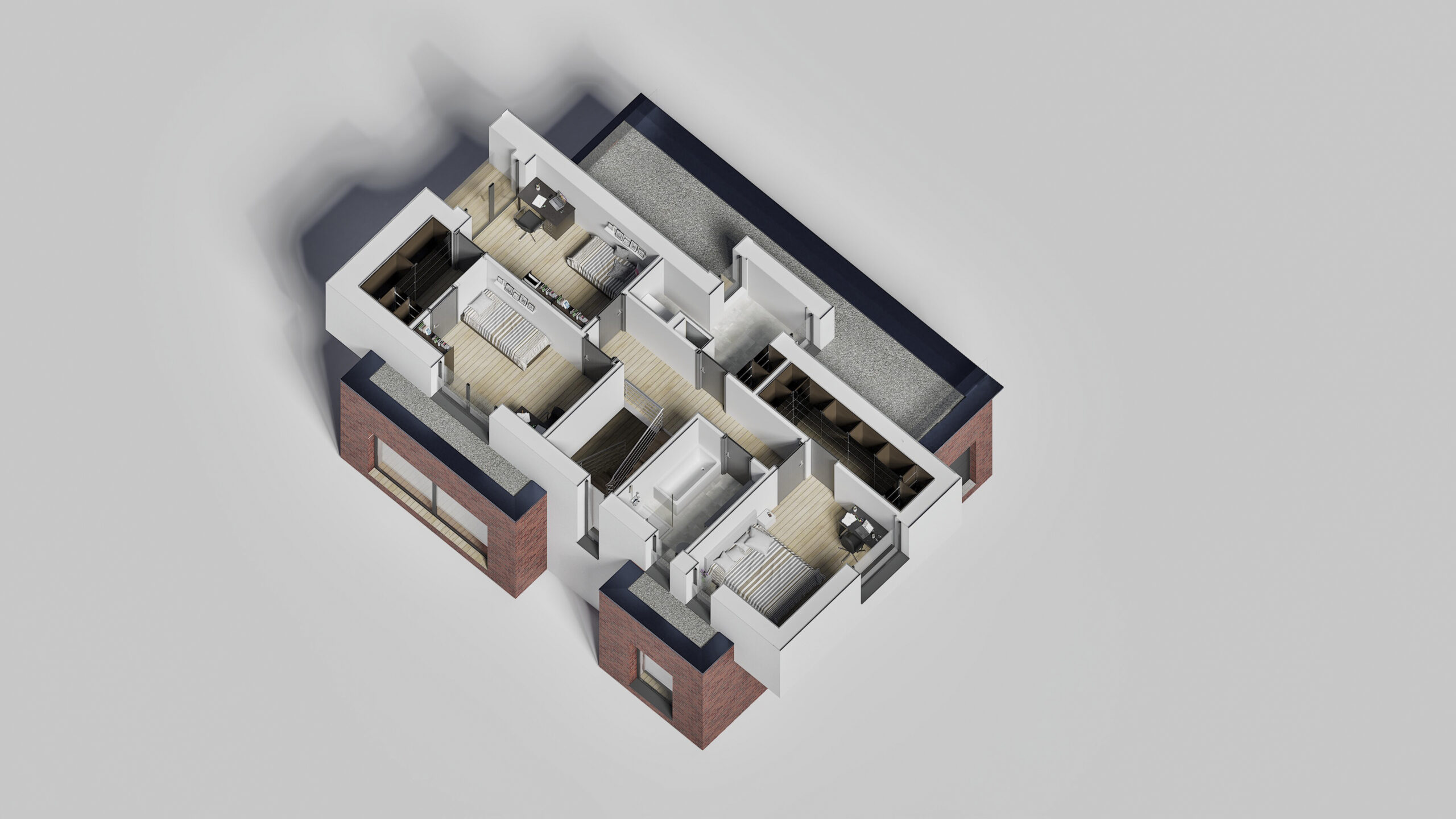 Główną część piętra stanowi część mieszkalna, do której dostawiona jest mniejsza kubatura z łazienką i pralnią.